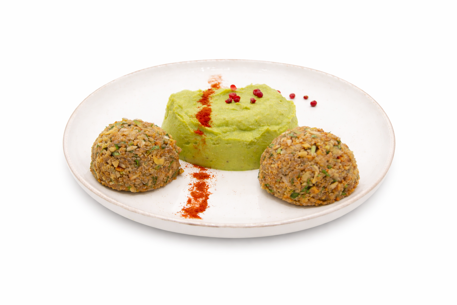 CONȚINE: chifteluțe de quinoa (quinoa, morcovi, țelină, ceapă albă, pătrunjel, mărar, ulei floarea soarelui presat la rece, garam masala (coriandru, chimen, scorțișoară, ardei negru, dafin, cuișoare, anason, cardamom.), sare, piper)100g, piure de mazăre (mazăre (produs congelat), usturoi, lămâie, sare)200g