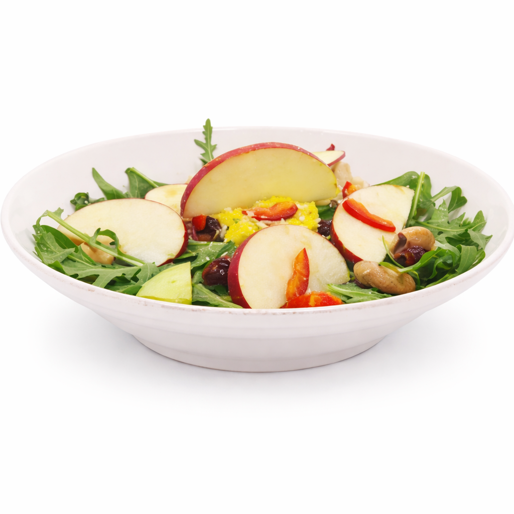 CONȚINE: măr 100g, spanac 30g, rucola 30g, roșii deshidratate 20g, caju prăjit 20g, cremă de caju cu turmeric (caju crud, fulgi de drojdie inactivă, lămâie, turmeric, sare)30g, castraveți, ardei kapia, lămâie, ulei de floarea soarelui presat la rece, sare